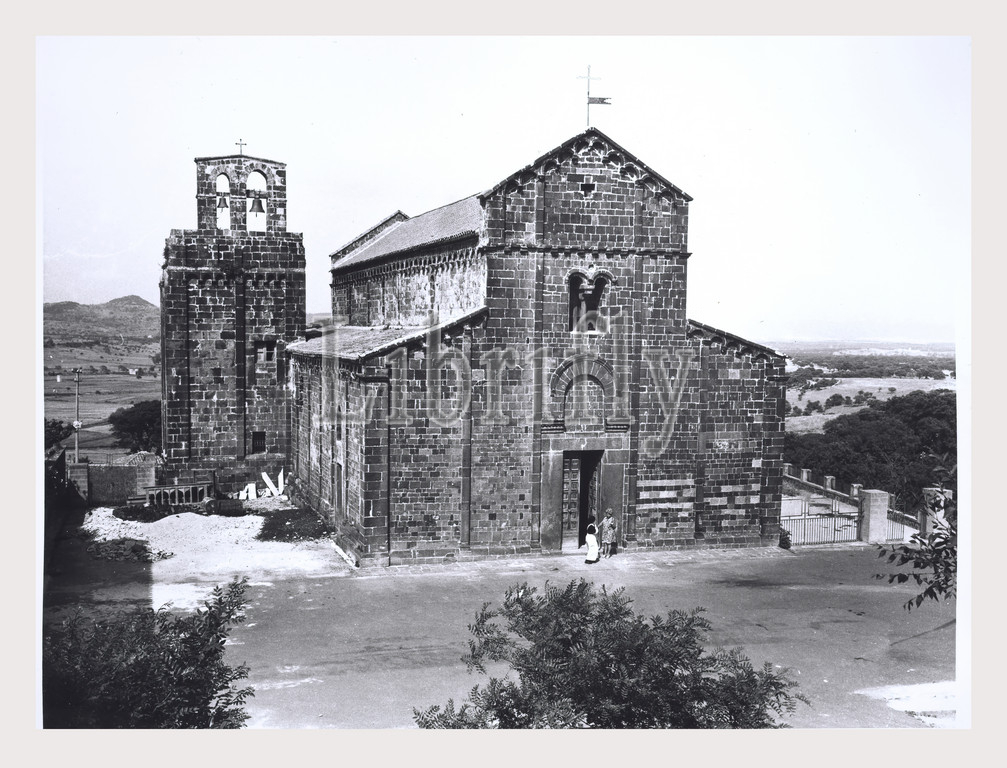 Sardinia Sassari Ardara S. Maria del Regno, this is my Italy, the italian country of visual history, Medieval Romanesque architecture 1170, recently restored. Typically Sardinian influenced by Lombard and Pisan forms of the 11th century with slender pilasters, bifora window, small decorative arches along the cornice, semi-circular apse, and short campanile. Triple aisled basilica plan. Central nave has bare, beamed ceiling while side aisles are cross vaulted sculpted inscription from 1107. Post-medieval Polychromatic, gilded wooden sculpture Madonna and Child 15/16th century pulpit.