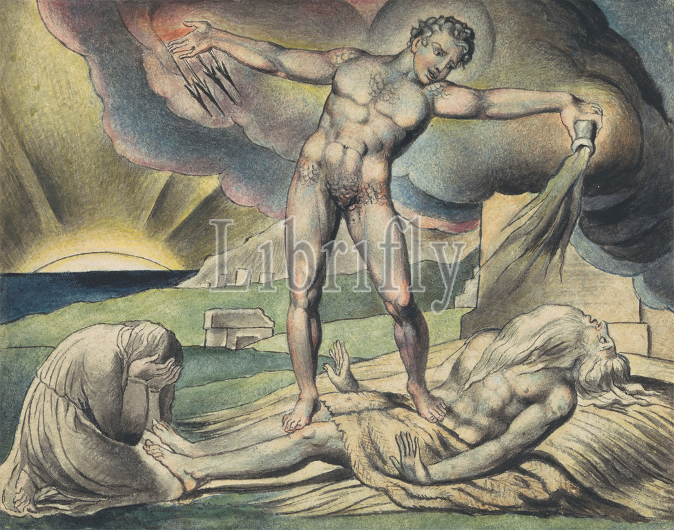 Satan Smiting Job, Boils, circle, John Linnell, 1792–1882, British, William Blake, 1757–1827, British, Watercolor, black ink, moderately thick, slightly textured, cream wove paper, Sheet, arrows, boils, crying, fear, ill, kneeling, nude, Old Testament, pain, religious, mythological subject, smiting, sunshine, wound