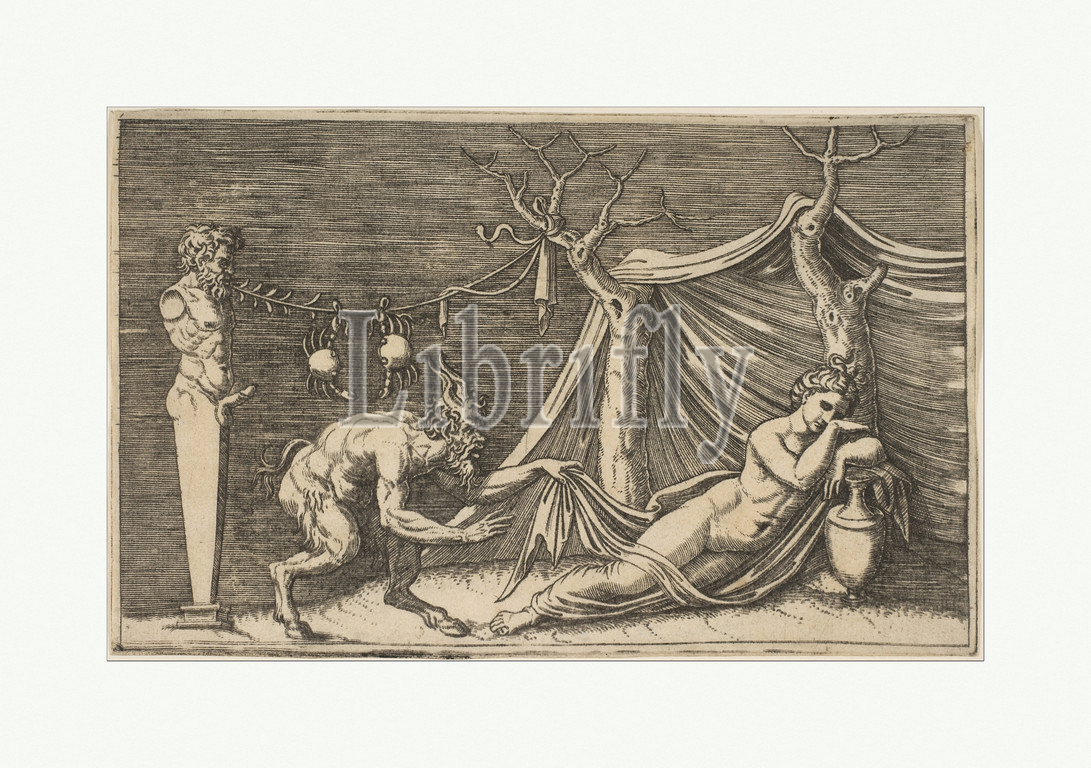 satyr discovering, sleeping woman, two crabs hanging, rope, strung, term, tree, ca, 1515–27, Engraving, Sheet, Trimmed, 4 7/16, 7 1/16, 11.3, 17.9 cm, Prints, Marco Dente, Italian, Ravenna, active by, 1515–died, 1527, Rome