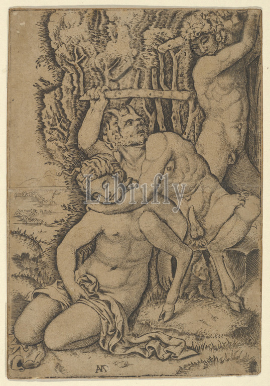 satyr fighting, nymph, Francia, ca, 1510–20, Engraving, Sheet, 4 5/8, 3 1/8, 11.7, 8 cm, Prints, Marcantonio Raimondi, Italian, Argini, ca., 1480–before, 1534, Bologna, After Francesco Francia, Bologna ca., 1447–1517