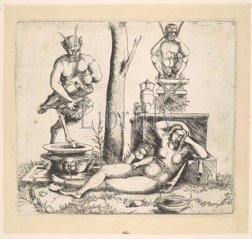 Satyr Playing, Lyre, Sleeping Nymph, ca, 1515, Engraving, Sheet, 9 3/8 x 7 1/8, 23.8 18.1 cm, Prints, Master of, Even, nationality, idiosyncratic artist, created, print, uncertain, definite information, date, prints, knowledge, several, architectural motifs derive, sketchbook attributed, Milanese sculptor, Agostino, Busti