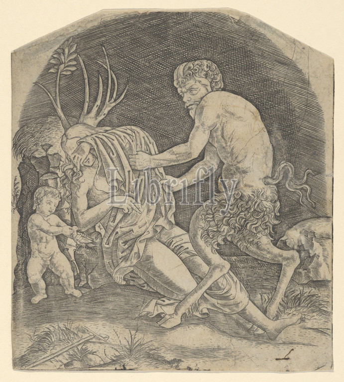 satyr, remove drapery covering, Nymph, ca, 1510–20, Engraving, Sheet, 5 11/16, 1/16, 14.5, 12.9 cm, Prints, Marcantonio Raimondi, Italian, Argini, ca., 1480–before, 1534, Bologna