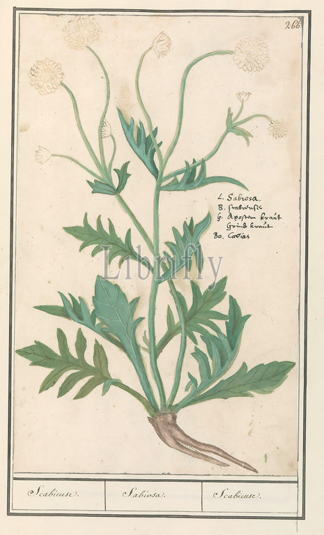 Scabiosa, Knautia Scabieuse, Sabiosa, Scabieuse, title, object, Knautia, Numbered top right, 266, Right, name, four languages, Part, third album, drawings, flowers, plants, Tenth, twelve albums, animals, birds, 1600, commissioned, Emperor Rudolf II, explanations, Dutch, Latin, French, Anselmus Boetius de Boodt, 1596, 1610, paper, watercolor, paint, deck paint, chalk, ink, pen