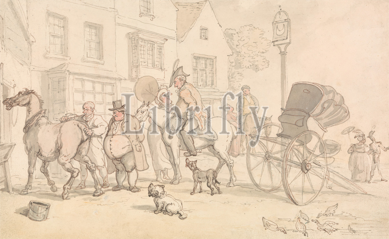 Scene outside the Half-Moon Inn, Thomas Rowlandson, 1756–1827, British, undated, Watercolor with pen and brown ink and pen and gray ink over graphite on medium, slightly textured, cream wove paper, Sheet: 5 3/4 x 9 5/16 inches (14.6 x 23.7 cm), bucket (vessel), buildings, carriage, cityscape, dogs (animals), genre subject, inn, men, outside, parasol, pigeons (general term), sign posts, windows, women
