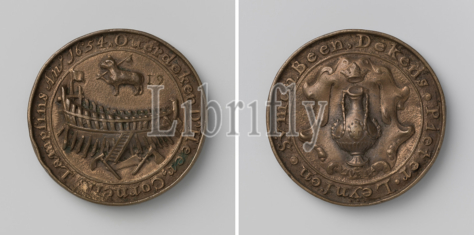 Scheepmakersgilde van Vlissingen, guild token, no, 19, Brass medal, Front, ship under construction, flag, bow, saw, two axes, ship, lamb, banner next, number 19 inside, inscription, Reverse, crowned bottle, cartouche, lower edge within, Flushing, Cornelis Lampsins, Pieter Leynsen, Symon, 1654, brass, alloy, engraving