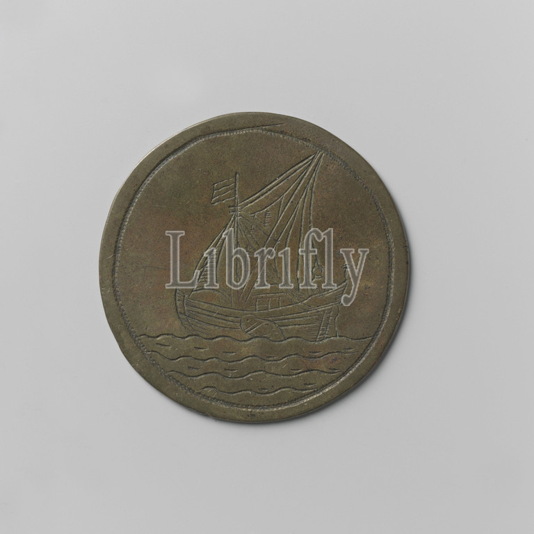 Schippers guild, guild token, Cornelis Tonboeijer, no, 22, Brass medal, Front, ship sailing, left, back court, man, Reverse, inscription under number 22 within, double circle, Netherlands, c, 1400, 1885, brass, alloy, engraving