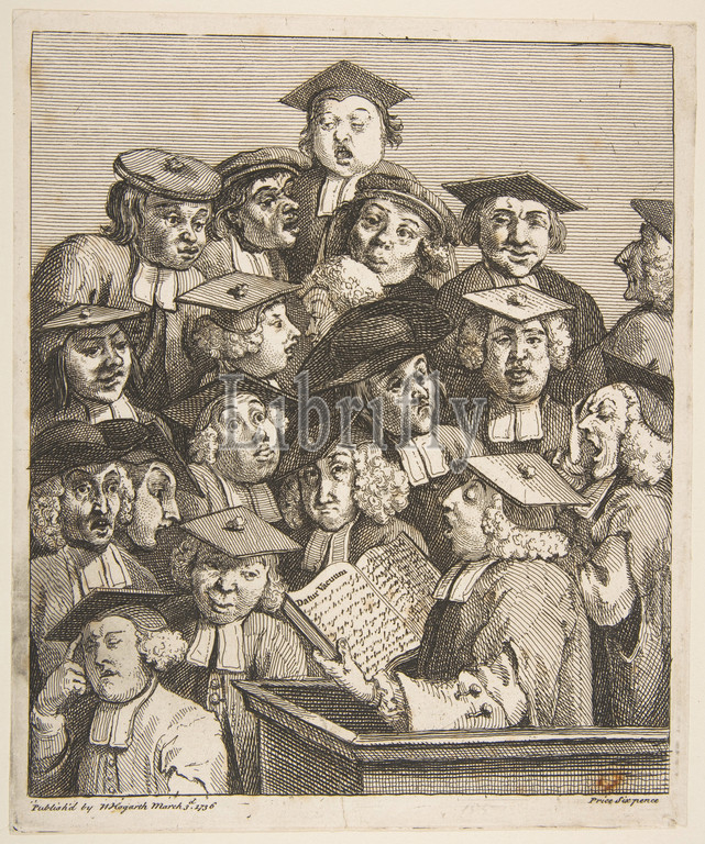 Scholars, Lecture, March 3, 1736, Etching, engraving, second state, two, sheet, 8 11/16 x 7 5/16, 22 18.6 cm, Prints, William Hogarth, British, London, 1697–1764
