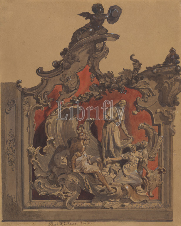 School, St. Rocco, Venice, Study, Curved Decoration, Thomas Hartley Cromek, 1809–1873, British, ca, 1835, Watercolor, gouache, pen, brown ink, graphite, moderately thick, slightly textured, brown wove paper, Sheet, Sheet, angel, architectural subject, decoration, drapery