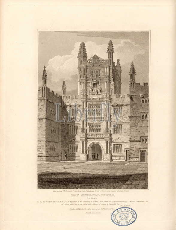 The Schools-Tower, Oxford, Oxford, Order, Engraved by W. Woolnoth, Engraved by F. Mackenzie, Fig. 70, according to p. 90, Mackenzie, F. (drawing); Woolnoth, William (engraving), 1812, John Britton: The architectural antiquities of Great Britain: represented and illustrated in a series of views, elevations, plans, sections and details of various ancient English edifices: with historical and descriptive accounts of each. Bd. 3. London: J. Taylor, 1807-1826