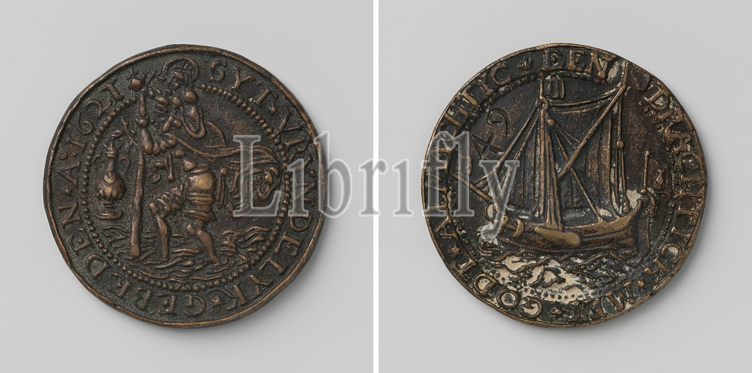 Schuitmans Guild of Vlissingen, Guild Medal with No. 49, Brass Medal. Obverse: leaning on a stick, St. Christophorus carries Christ child with his globe in hand through water, left: crowned bottle inside the cover. Reverse: two-mast sailing to the left with flag on stern, top left: numeral 49 within a circle, Flushing, anonymous, 1621, brass (alloy), engraving, d 4.3 cm × w 23.22 gr