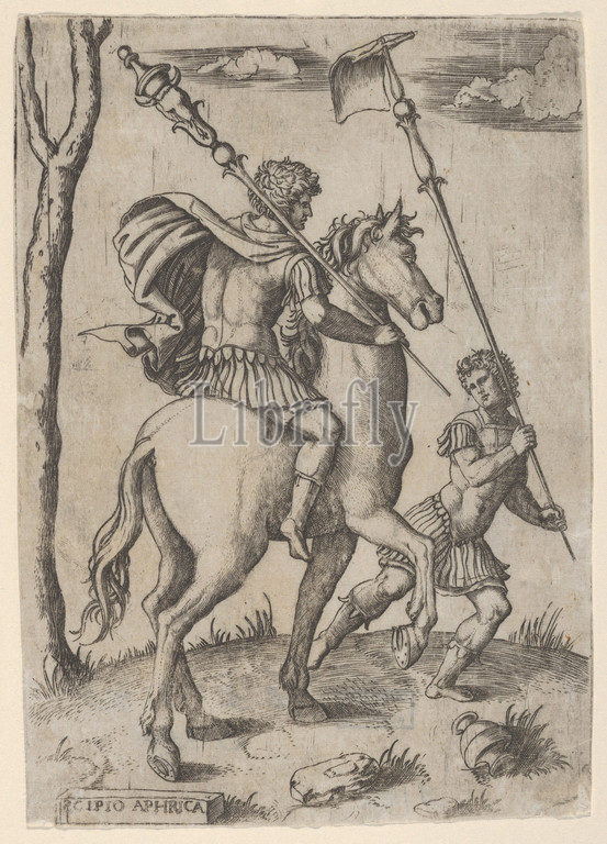 Scipio Africanus, horseback preceeded, foot soldier holding, standard, ca, 1500–1534, Engraving, Sheet, 6 11/16, 4 3/4, 17, 12 cm, Prints, Marcantonio Raimondi, Italian, Argini, ca., 1480–before, 1534, Bologna
