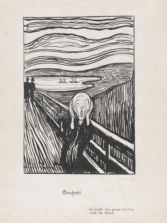 Scream, 1895, Lithograph, Image, 14 1/16 x 9 5/16, 35.7 23.6 cm, Prints, Edvard Munch, Norwegian, Løten, 1863–1944, Ekely, extreme, familiarity, image today, makes, hard, realize, shocking, works, Munch, created slightly, hundred years, ago, art represented, own emotions, mostly, darker ones, fear, dread, loneliness, sexual longing, extraordinary expressiveness