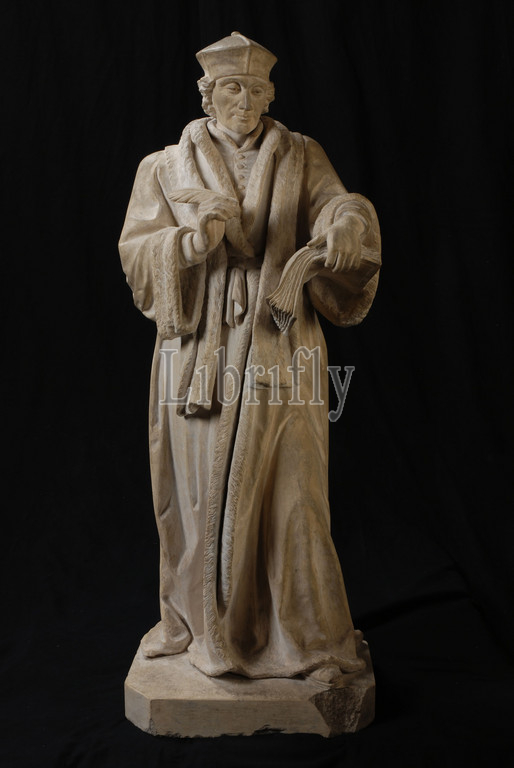 sculptor: Leo Paulus Johannes Stracké, Standing statue of Erasmus with book and quill pen in hand, sculpture sculpture sandstone stone, pedestal) 83 kg LPS in monogram on pedestal Erasmus Rotterdam