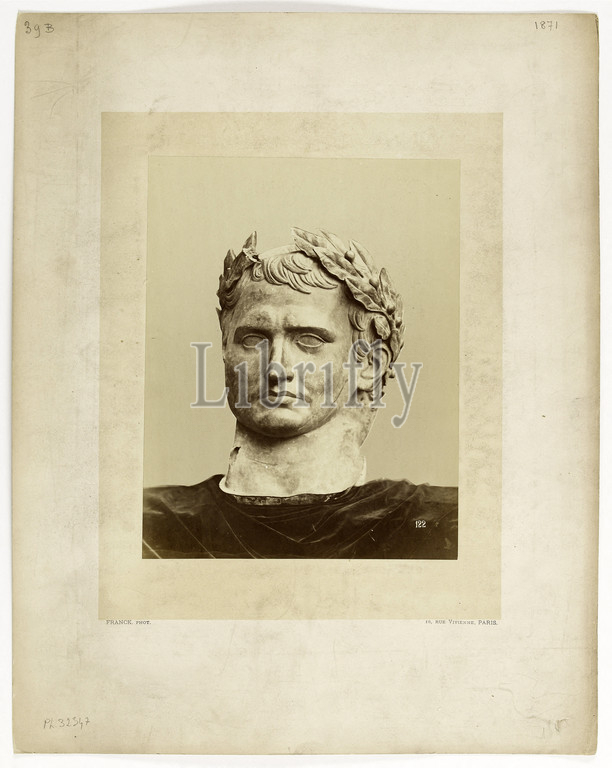 Sculpture of the head of Napoleon I (as a Roman emperor), photographed on a cloth, after the destruction of the Vendôme column during the Paris Commune by the communards on May 16, 1871. Statue by Antoine-Denis Chaudet (1763-1810 ), 1st..., Franck (François Gobinet de Villechole, dit), Photographer, 1871, Graphic arts, Photography, Albumen paper print, Paris, Dimensions - Work: Height: 24 cm, Width: 18.7 cm, Dimensions - Montage: Height: 44 cm, Width: 34.7 cm, Dimensions: Height: cm, Width: cm