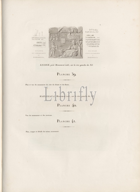 Sculpture, on the monument to the Maharraga, Egyptian Art in al-Maharraqa, Pl. 8, p. 83, Franz Christian Gau; Barthold Georg Niebuhr: Antiquités de la Nubie: ou monumens inédits des bords du Nil, situés entre la première et la seconde cataracte: ouvrage faisant suite au grand ouvrage de la Commission D'Egypte; dédié au Roi. Stuttgart: aux frais de la Librairie de J. G. Cotta; Paris: Imprimerie et Librairie de Firmin Didot, MDCCCXXII. [1822]