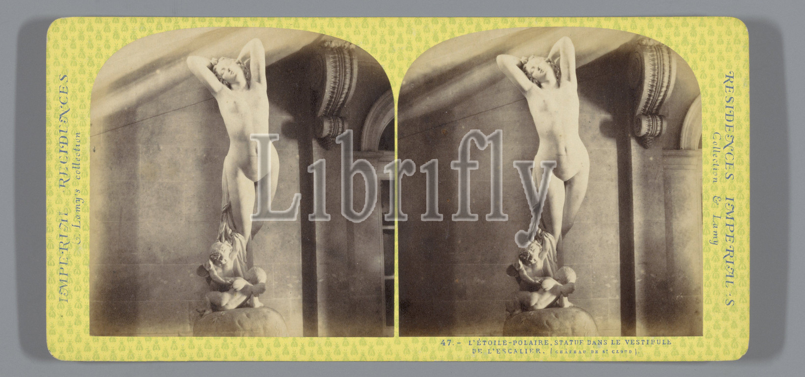 Sculpture, stairwell, castle, Saint-Cloud, depicting, Pole Star, L'Etoile-Polaire, Statue dans le Vestibule de l'Escalier, Imperial Residences, series title, Ernest Eléonor Pierre Lamy, mentioned, Kasteel van Saint-Cloud, c, 1860, 1870, cardboard, albumen print, height 85 mm, width 170 mm