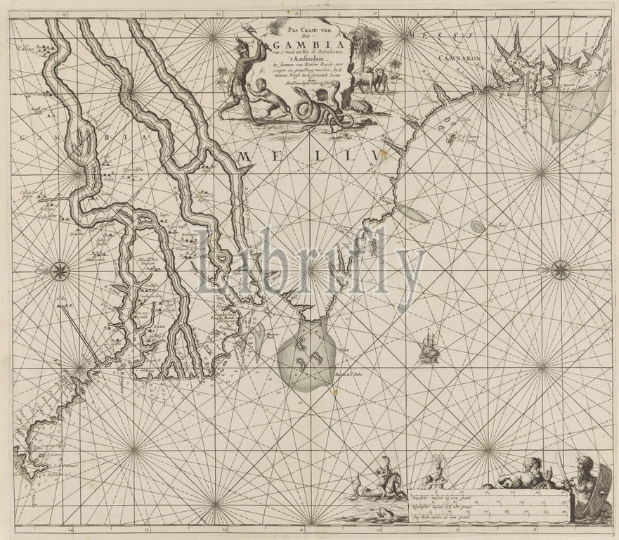 Sea chart, coast, Gambia, part, Senegal, Guinea, Sierra Leone Pas caarte, Rio Gambia, C, Verde, Rio de Serraliones, title, object, Sierra Leone, two compass roses, North, left, top center, publisher's address, next, dark man, feather-tip, hack, two snakes, ax, monkey runs away, snakes, Two buffalo, background, Bottom right, mermaids, sea snake, scale, shown, German, Spanish, English, French miles, c, 1, 1 500 000, sailing ship, sailing boat, monsters, sea, monkeys, apes, Cape Verde islands, Jan Luyken, Amsterdam, 1683, 1799, paper, engraving