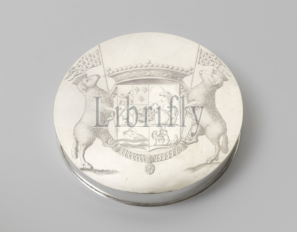 Seal box by Cornelis Lampsins, Round flat box with lid engraved with a crowned weapon surrounded by chain of order (St. Michel), carried by two crowned sheep, each wearing a pennant strewn with (French) lilies. In the edge of the box is a slot for the cord to which the seal was attached, West Indies, Cornelis Lampsins, Louis XIV (King of France), anonymous, The Hague (possibly), 1663, silver (metal), engraving, d 13.3 cm × h 2.0 cm × w 288 gr