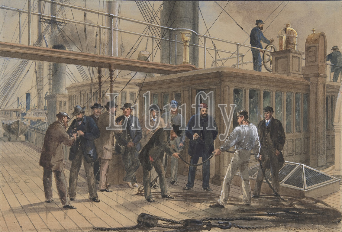 Searching for the Fault after Hauling Back the Cable from the Bottom of the Atlantic, July 31st, 1865, 1865, Watercolor over graphite with touches of gouache, Sheet: 7 in. × 10 1/4 in. (17.8 × 26.1 cm), Drawings, Robert Charles Dudley (British, 1826–1909), One of the 19th century's great technological achievements was to lay a telegraphic cable beneath the Atlantic, allowing messages to speed back and forth between North America and Europe in minutes, rather than ten or twelve days by steamer