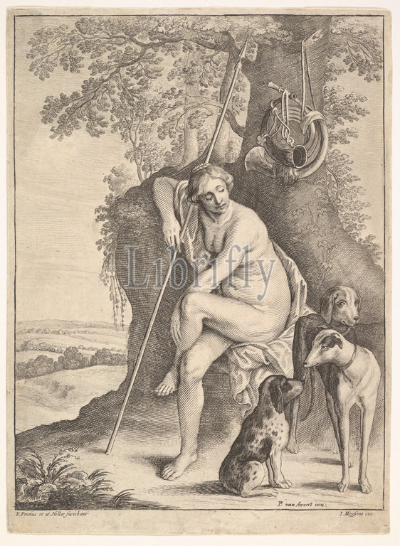 Seated figure, Diana, huntress, 1625–77, Etching, drypoint, engraving added, Paulus Pontius, third state, Sheet, 8 5/8, 6 1/4, 21.9, 15.9 cm, Prints, After Pieter van Avont, Flemish, 1599–1652, Diana seated, naked, under, tree, holding, spear, looking towards, three, dogs, standing, sitting beside, right, two hunting, horns, hanging, branch, fields, background