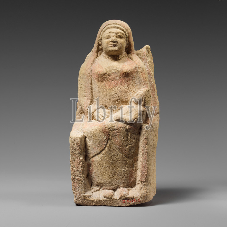 Seated limestone kourotrophos, Archaic, late 6th century B.C, Cypriot, Limestone, H, 7 1/4 x W, 3 xD, 2 1/2, 18.4 8.3 6.3 cm, Stone Sculpture, Statue, nursing mother, long veil seated, high-backed throne, woman occupies, seat, partially broken, back, armrests, knees, holds, small baby, wears, hood