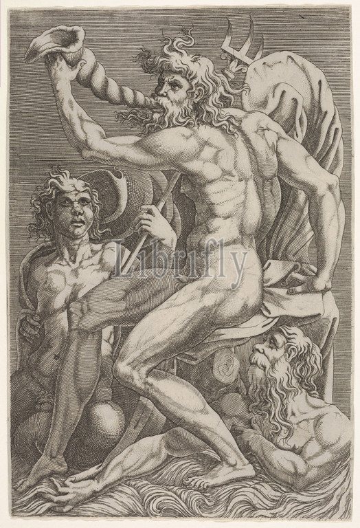 Seated Neptune holding, conch shell, mouth, accompanied, seated triton, another emerging, water, bottom right, Engraving, sheet, 9 1/8 x 6 1/8, 23.2 15.6 cm, Prints, Attributed to Giorgio Ghisi, Italian, Mantua ca., 1520–1582, Mantua, After Perino del Vaga, Pietro Buonaccorsi, Florence, 1501–1547, Rome