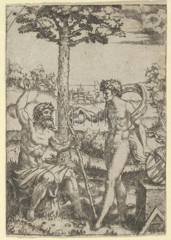 Seated old shepard gesturing towards the sky and speaking to nude male surrounded by tools of measurement, ca. 1500–1534, Engraving; second state of two, Sheet: 2 15/16 × 1 15/16 in. (7.5 × 5 cm), Prints, Marcantonio Raimondi (Italian, Argini (?) ca. 1480–before 1534 Bologna (?)), After Raphael (Raffaello Sanzio or Santi) (Italian, Urbino 1483–1520 Rome)