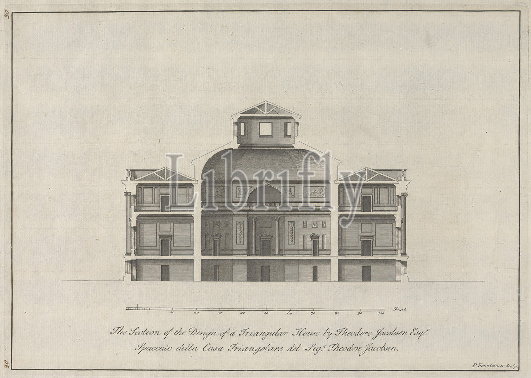Section, Design, Triangular House, Theodore Jacobsen Esqr., Paul Fourdrinier, French, Theodore Jacobsen, died 1772, British, Etching, moderately thick, slightly textured, cream laid paper, Sheet, Plate, Image, arches, architectural drawing, architectural subject, columns, cross section, cupola, design, elevation, drawing, house, measurement, Neo-Classical, pediments, plan, drawing, reliefs, scale, rule, statues, triangular, windows