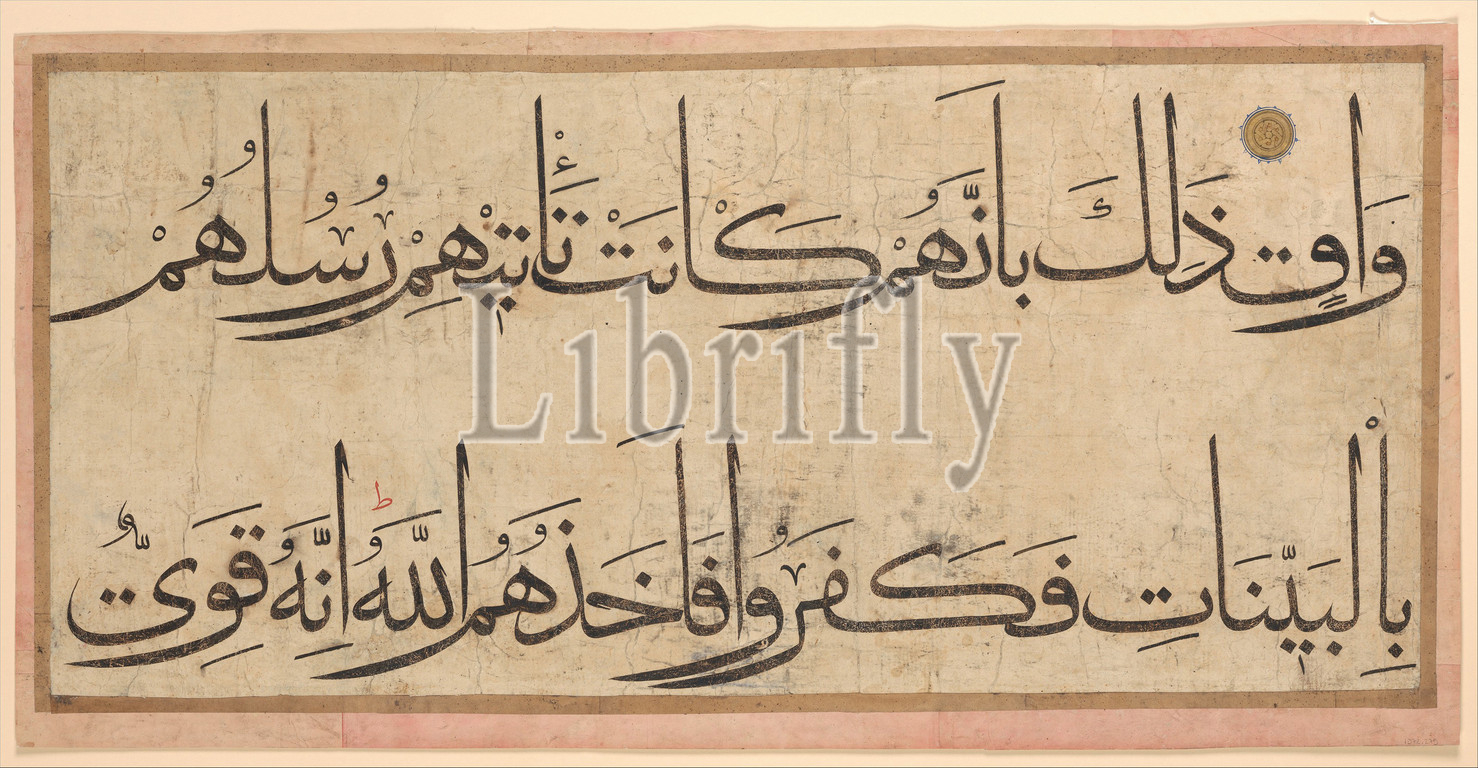 Section of a Qur'an Manuscript, late 14th–early 15th century, Attributed to present-day Uzbekistan, probably Samarqand, Ink, opaque watercolor, and gold on paper, H. 17 5/16 in. (44 cm), Codices, These two lines of calligraphy in elegant muhaqqaq script are from chapter 40 (Sura al-Mu'min, The Believer) of the Qur'an. The fragment on which they are written was once part of a Qur'an manuscript that is probably the largest ever produced