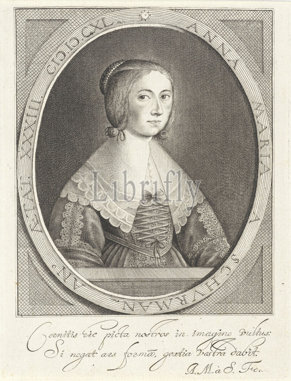 Self-portrait, Anna Maria van Schurman, scholar, poet, artist, portrait, self-portrait, mentioned, object, 1640, paper, engraving
