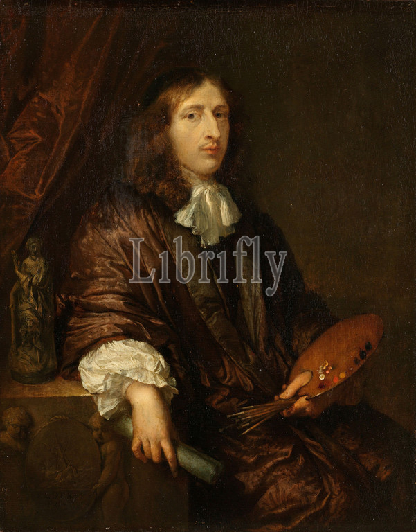 Self-Portrait, Self-portrait, painter Caspar Netscher, Knee, sitting, roll, paper, right hand, palette, brushes, left, pedestal, relief, two putti, shield, barge, statue, Caspar Netscher, 1660, 1684, panel, oil paint, paint
