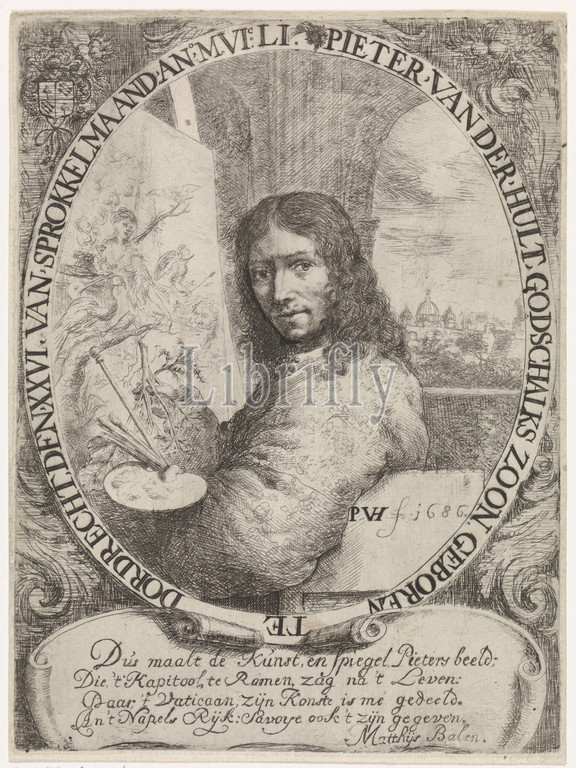 Self-portrait of Pieter van der Hulst (IV), Pieter van der Hulst half to the left, sitting in front of a painting. In his hand he holds a palette, brushes and a cane. Right through the window view of the city of Rome. Portrait in an oval with border lettering in Dutch. At the bottom a four-line text on a cartouche in Dutch, Pieter van der Hulst (IV), Pieter van der Hulst (IV) (mentioned on object), Dordrecht, 1686, paper, engraving, h 201 mm × w 150 mm