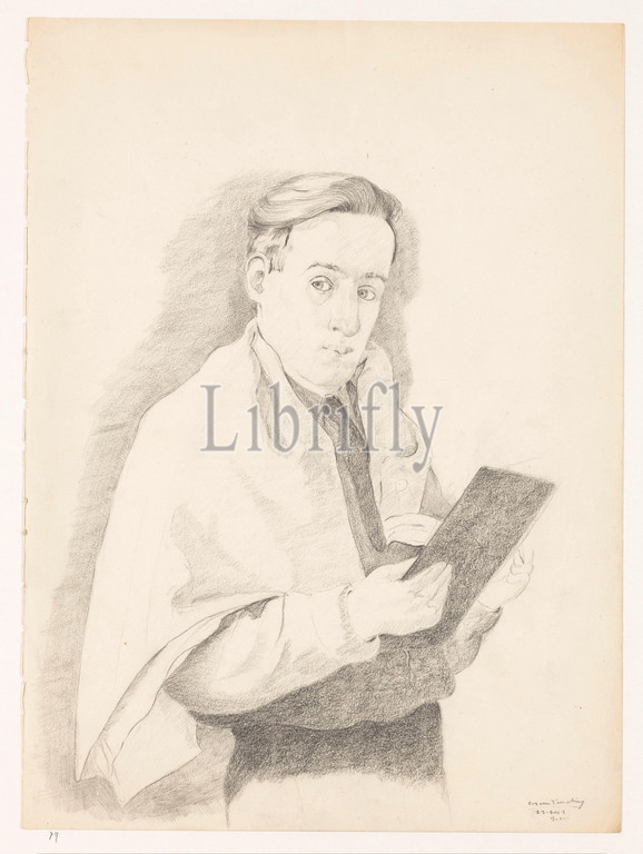 Self-portrait standing, sketchbook, B-1-1, February 23, Self-portraits, Cor van Teeseling, series title, Self-portrait, standing Cor van Teeseling, sketchbook, B-1-1, February 23, Signed self-portrait, standing Cor van Teeseling, sketchpad, hand, drawing, draughtsman, Cor van Teeseling, Weteringschans, 23-Feb-1942, paper, pencil, height 36.5 cm, width 26.5 cm