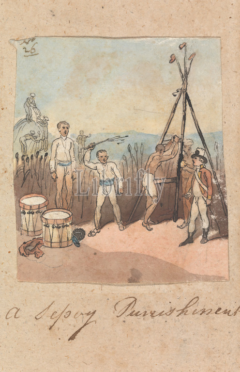 Sepoy Punishment, Robert Mabon, died 1798, British, Watercolor, graphite, pen, black ink, medium, slightly textured, cream wove paper, Sheet, drums, military art, punishment, soldiers, whipping, whips, animal equipment