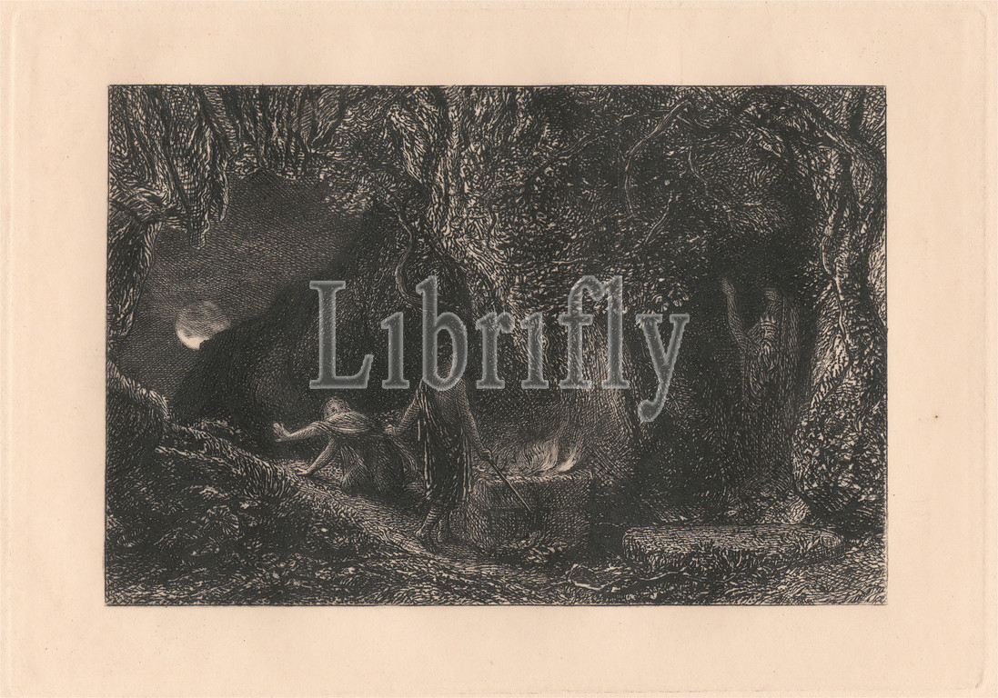 Sepulchre, Print, Samuel Palmer, 1805–1881, British, active, Italy, 1837–39, completed, Alfred Herbert Palmer, 1853–1931, British, 1880, 1883, Etching, drypoint, plate tone, moderately thick, slightly textured, cream laid paper, Sheet, Plate, Image, altar, dark, eclogues, figures, fire, flames, forest, grave, landscape, literary theme, moon, night, shadow, statue, tomb, trees