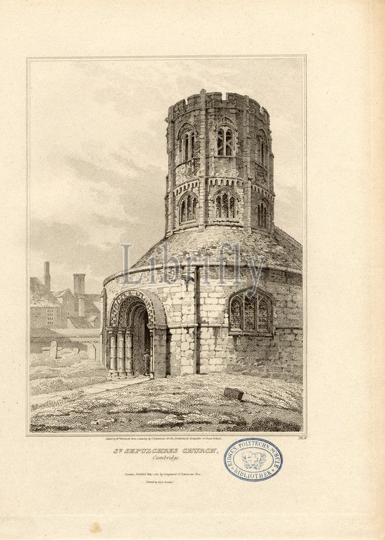 St. Sepulchres Church, Cambridge, Church of the Holy Sepulcher, also The Round Church, in Cambridge, signed: Etch'd by W. Woolnoth, from a drawing by F. Mackenzie, Fig. 68, Pl. IV, after p. 90, Mackenzie, F. (drawing); Woolnoth, William (etching), 1812, John Britton: The architectural antiquities of Great Britain: represented and illustrated in a series of views, elevations, plans, sections and details of various ancient English edifices: with historical and descriptive accounts of each. Bd. 3. London: J. Taylor, 1807-1826
