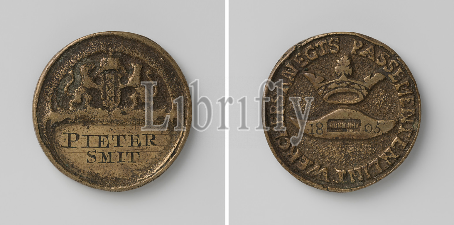 Servants of the bullion and ribbonworker's guild of Amsterdam, guild token by Pieter Smit, Messing token. Front: crowned coat of arms, flanked by two lions above cartouche with inscription. Reverse: weaver's coil under crown within cover, on ends of coil: year, Amsterdam, Pieter Smit, anonymous, 1805, brass (alloy), engraving, d 3.2 cm × w 22.90 gr
