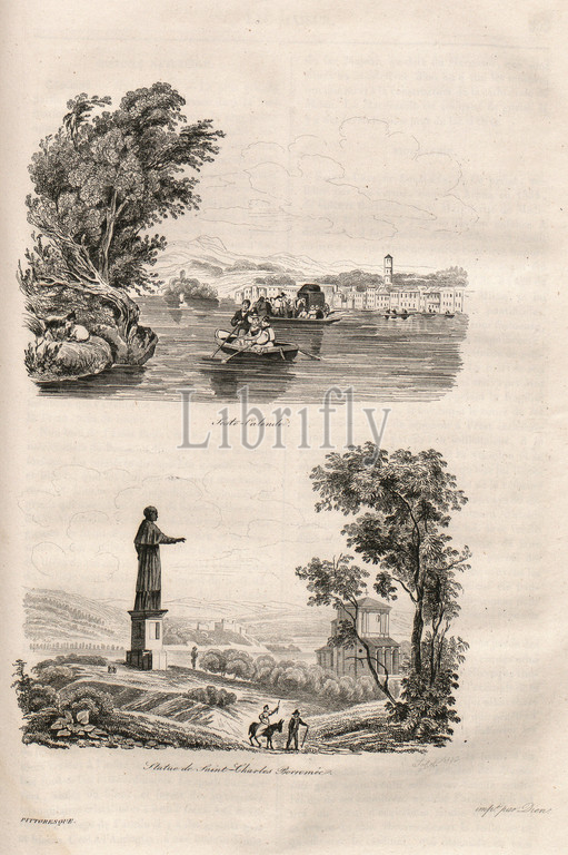 Sesto-Calende - Statue of Saint. Charles Borromeo, Above: View of Sesto Calende (Lombardy), below: Statue of Charles Borromeo, in the background right: the church dedicated to him Sacro Monte di Arona, to p. 302, Joliot, 1835, Alexandre Martin: La Suisse pittoresque et ses environs. Tableau général, descriptif, historique et statistique des 22 cantons, de la Savoie, d'une partie du Piémont et du pays de Bade. Paris: Hippolyte Souverain, 1835