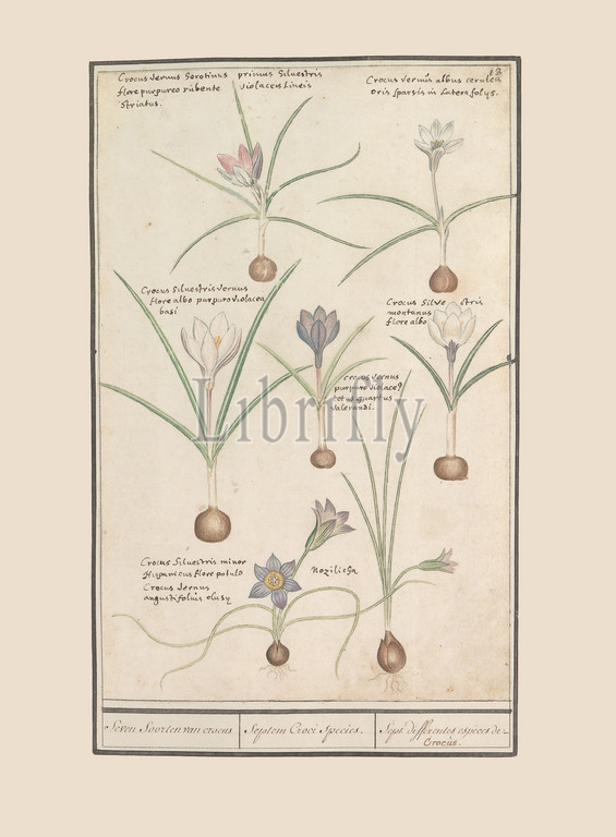 Seven crocuses (Crocus) Seven species of crocus / Septem Croci species. / Sept differentes espieces de Crocus (title on object), Leaf with seven different crocuses. Numbered top right: 13. With the Latin names. Part of the first album with drawings of flowers and plants. Eighth of twelve albums with drawings of animals, birds and plants known around 1600, commissioned by Emperor Rudolf II. With explanations in Dutch, Latin and French, flowers: crocus, Anselmus Boetius de Boodt, 1596 - 1610, paper, watercolor (paint), deck paint, chalk, ink, pen, h 300 mm × w 193 mm