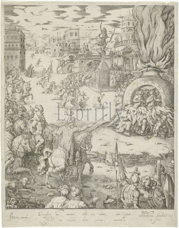 Shadrach, Meshach, Abednego, fiery furnace, Babylonian king Nebuchadnezzar, horseback, surrounded, soldiers sees, miraculously assisted, fourth figure, burning furnace, makes, king decide, order, salvation, background, kneeling figures, golden statue, erected outside, city, Babylon, three refused, worship, two lines, Latin, story, three Hebrews, Daniel 3, Abraham van den Hecken, mentioned, object, c, 1620, 1652, paper, engraving
