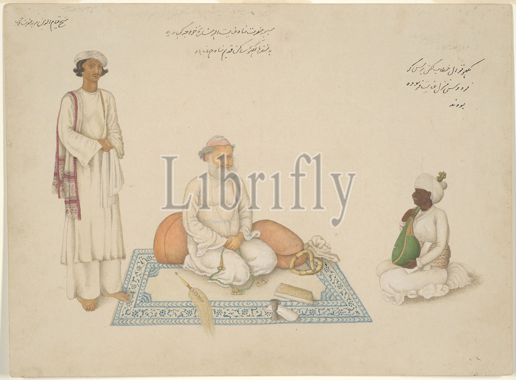 Shah Inayat Allah of Sind with his Musician Makkhu and his Attendant Shaykh Qiyam al-Din, page from the Fraser Album, Company School, c. 1820, India, Delhi, India, Opaque watercolor on paper, 30.6 x 41.5 cm (12 1/16 x 16 1/4 in.)