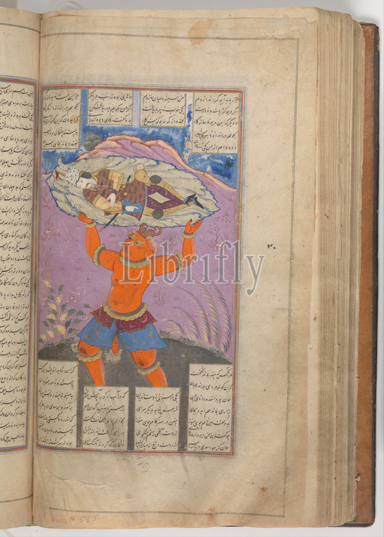 Shahnama (Book of Kings) of Firdausi, 1660s, Attributed to Iran, probably Isfahan, Ink, opaque watercolor, gold, and silver on paper, Painting (folio 158v): H. 9 15/16 in. (25.2 cm), Codices, Painting by Mu'in Musavvir (active ca. 1630–97), Fol. 158v: The Div Akvan carries Rustam to the Sea On a quest to find a div (demon) that had been killing the shah’s herds, Rustam grew tired and went to sleep in a meadow. The div, Akvan, spied him and lifted him with the mound of earth on which he lay