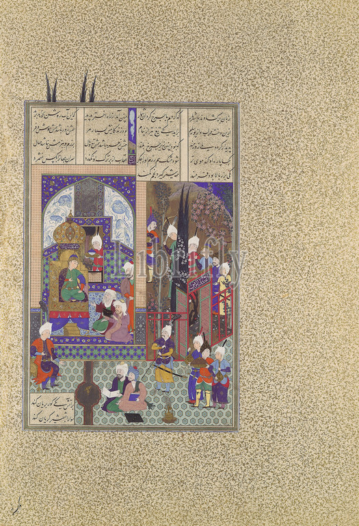 'The Shah's Wise Men Approve of Zal's Marriage', Folio 86v from the Shahnama (Book of Kings) of Shah Tahmasp, ca. 1525–30, Made in Iran, Tabriz, Opaque watercolor, ink, silver, and gold on paper, Painting: H. 12 1/2 in. (31.8 cm), Codices, Painting attributed to 'Abd al-'Aziz (active first half 16th century), Zal was the son of Sam of the house of Nariman, the ruling family of Sistan who had been vassals and faithful supporters of the Iranian crown for a long time. During his travels to the east, Zal fell in love with the beautiful Rudaba, daughter of the ruler of the rival kingdom of Kabul