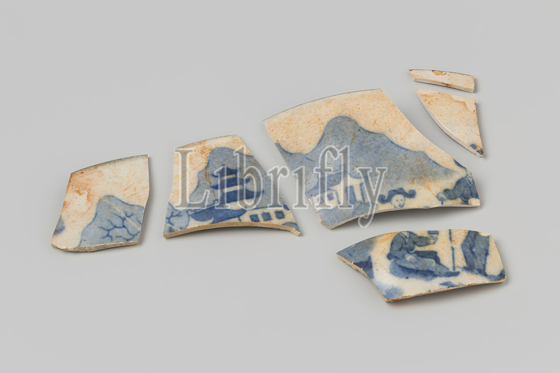 Shards, dish, wreck, East Indies ship 't Vliegend Hart, Six shards, porcelain dish, Delft blue, drawing, sides, Bowl, Dutch East India Company, 't Vliegend Hart, ship, Netherlands, 1700, 2-Mar-1735, porcelain, material