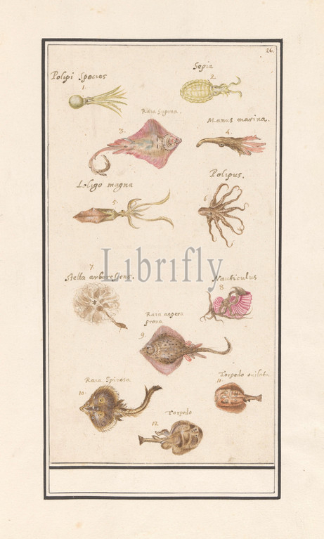 Sheet, twelve fish, cuttlefish, numbered 1-12, Latin names, Numbered top right, 26, Part, sixth album, drawings, fish, shells, insects, Sixth, twelve albums, animals, birds, plants, 1600, commissioned, Emperor Rudolf II, explanations, Dutch, Latin, French, fishes, molluscs, squid, octopus, Anselmus Boetius de Boodt, 1596, 1610, paper, watercolor, paint, deck paint, ink, pen