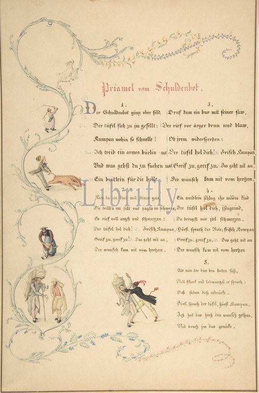 Sheets, Verses, Priamel vom Schuldenbot, late 18th–early 19th century, Pen, brown ink, brush, watercolor, Framing lines, pen, brown, 13 9/16 x 8 15/16, 34.5 22.7 cm, Drawings, Johann Martin Usteri, Swiss, Zurich, 1763–1827, Rapperswil