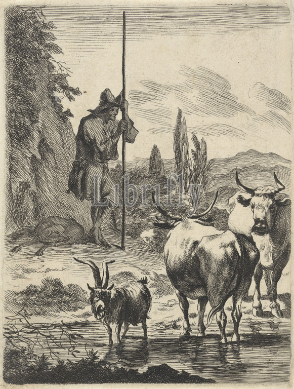 Shepherd, long stick, cattle, shepherd, leaning, front, rock, brook, herding, herdsman, herdswoman, shepherdess, cowherd, etc, cow, ford, Jan de Visscher, Northern Netherlands, 1643, 1692, paper, engraving