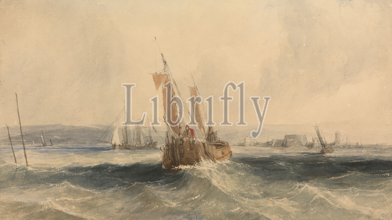 Shipping off, Isle, Wight, Alfred Gomersal Vickers, 1810–1837, British, Watercolor, graphite, pen, black ink, pen, brown ink, medium, moderately textured, cream wove paper, Sheet, marine art, ocean, sailors, sea, ship, waves, tidal, England, English Channel, Europe, Isle, Wight, United Kingdom, Vectis