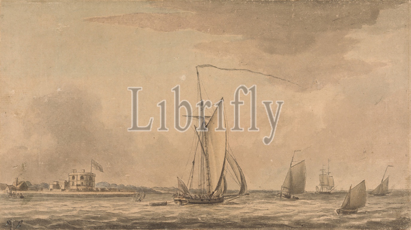 Shipping, Solent off Calshot Castle, Dominic Serres RA, 1722–1793, French, active, Britain, 1750s, 1760, 1793, Watercolor, black ink, gray ink, medium, moderately textured, cream wove paper medium, moderately textured, cream laid paper, Sheet, boats, castles, clouds, flags, houses, men, shipping, ships, Calshot, England, Hampshire
