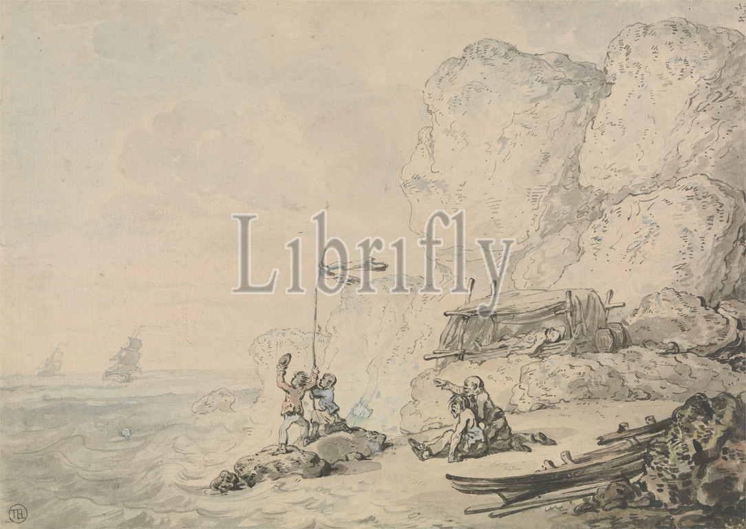 Shipwrecked Sailors, Thomas Rowlandson, 1756–1827, British, undated, Watercolor, with pen and black and gray ink over graphite on medium, slightly textured, cream laid paper, Sheet: 6 9/16 x 9 3/16 inches (16.7 x 23.3 cm), cliffs, landscape, marine art, rocks (landforms), sailors, ships, shipwreck, shore (landform), water